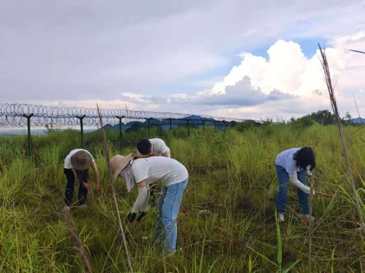 图为团队成员进行除草工作