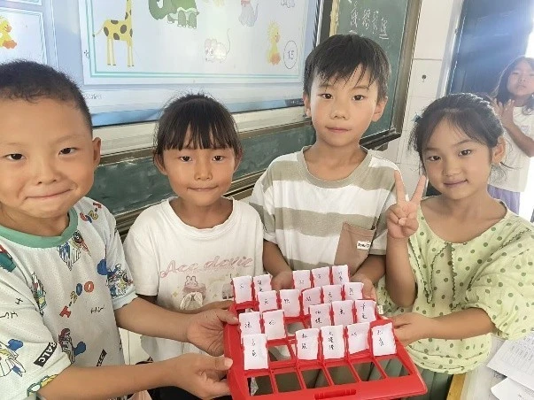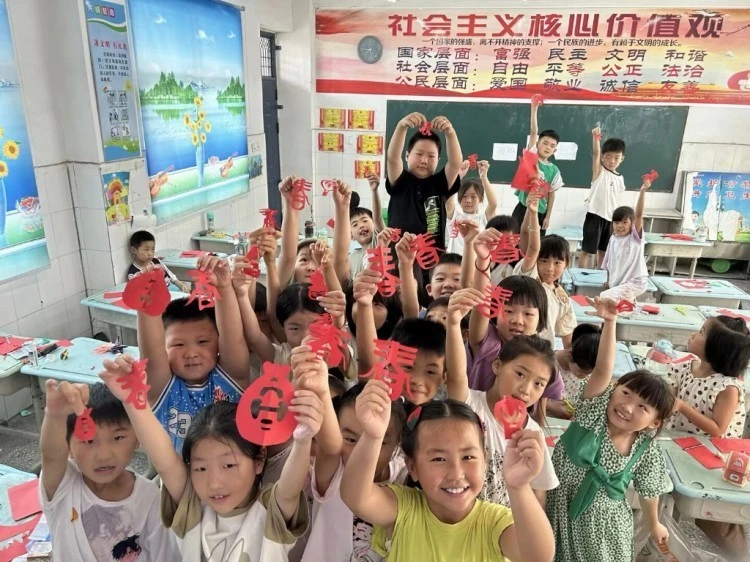 支教队员带领孩子们穿越时空,感受中华文化的博大精深。在非遗剪纸课堂上,一幅幅“福”字窗花在孩子们的指尖绽放,传统文化就这样走进他们的世界。在“汉字探秘”活动中,他们通过甲骨文猜字游戏,发现汉字背后的趣味与智慧,他们用稚嫩的笔触临摹着千年的文化密码。传统节日工坊中,孩子们用彩线制作的粽子,包裹着对民俗最纯真的理解。