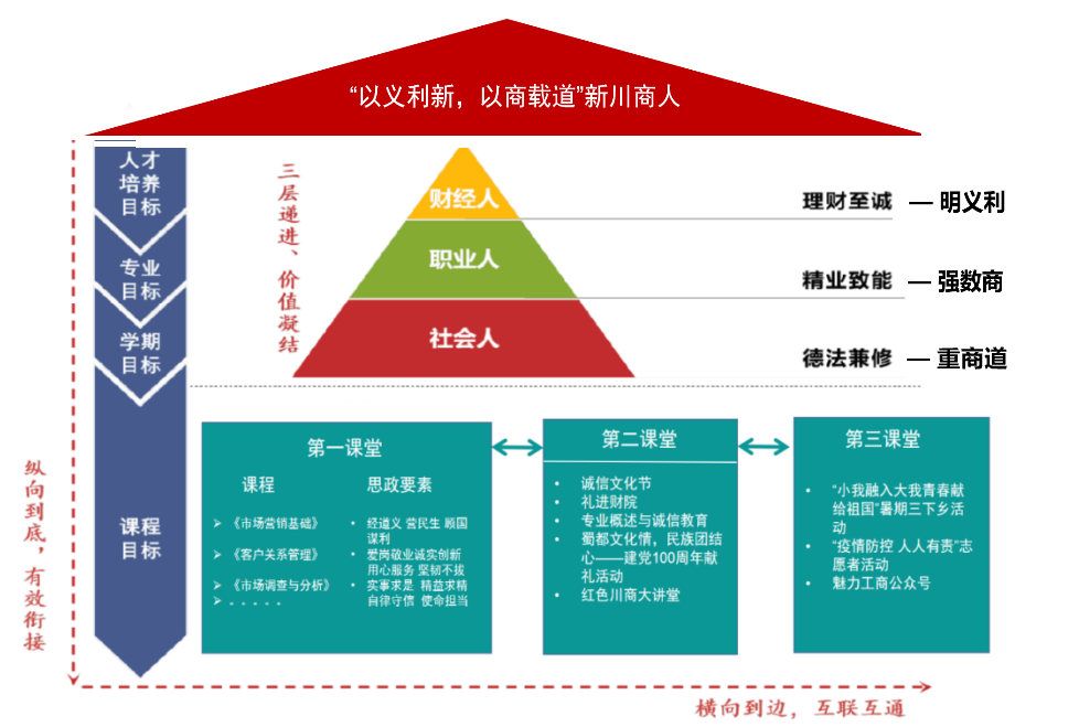 在学院“大思政”育人模式指引下,精准对接新商科人才需求,确立“秉承红色基因、扎根川商文化、顺应时代发展”专业特色思政目标。以培养“以德为先,义利并举”复合型营销人才为核心,构建“一道引领,四维支撑,十路行动”育人路径,并将思政目标融入专业人才培养方案。