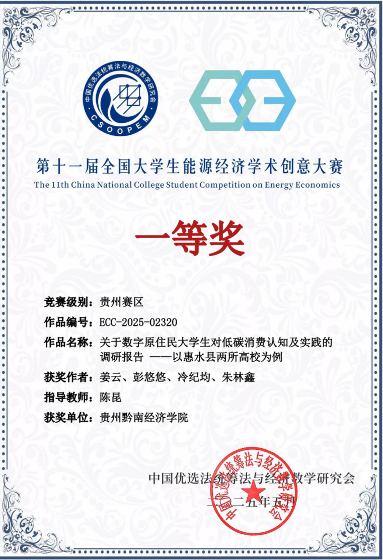 日前,在第十一届大学生能源经济学术创意大赛贵州赛区中,由贵州黔南经济学院金融党员教师陈昆指导,学生姜云、彭悠悠、冷纪均、朱林鑫四位同学组成的参赛队凭借作品《关于数字原住民大学生对低碳消费认知及实践的调研报告——以惠水县两所高校为例》荣获省级一等奖,展现了金融学院基层党建与课程专业实践深度融合的育人成效,是“党建+学科竞赛”的具体实践成果。