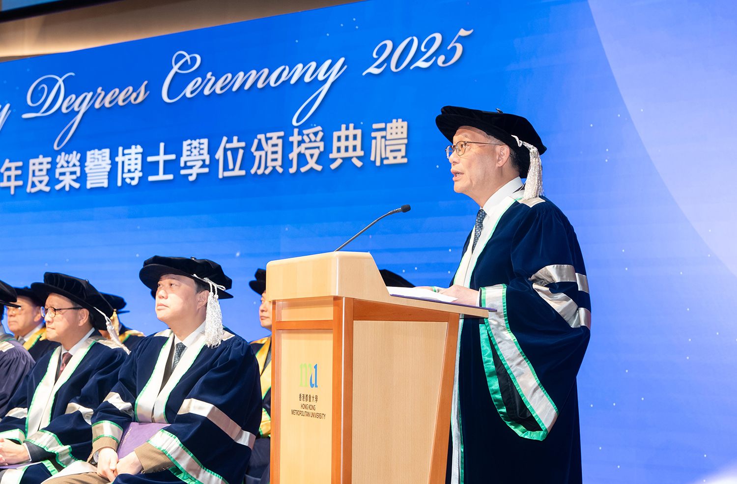 典礼开始前,全场站立默哀一分钟,悼念大埔宏福苑火灾罹难者。在典礼上,都大校长林群声教授向四位荣誉博士致以祝贺及敬意,并赞扬他们在经济、社会和文化发展方面持续作出的重要贡献,充分体现大学重视的价值,以及致力透过教育推动社会进步的坚定信念。