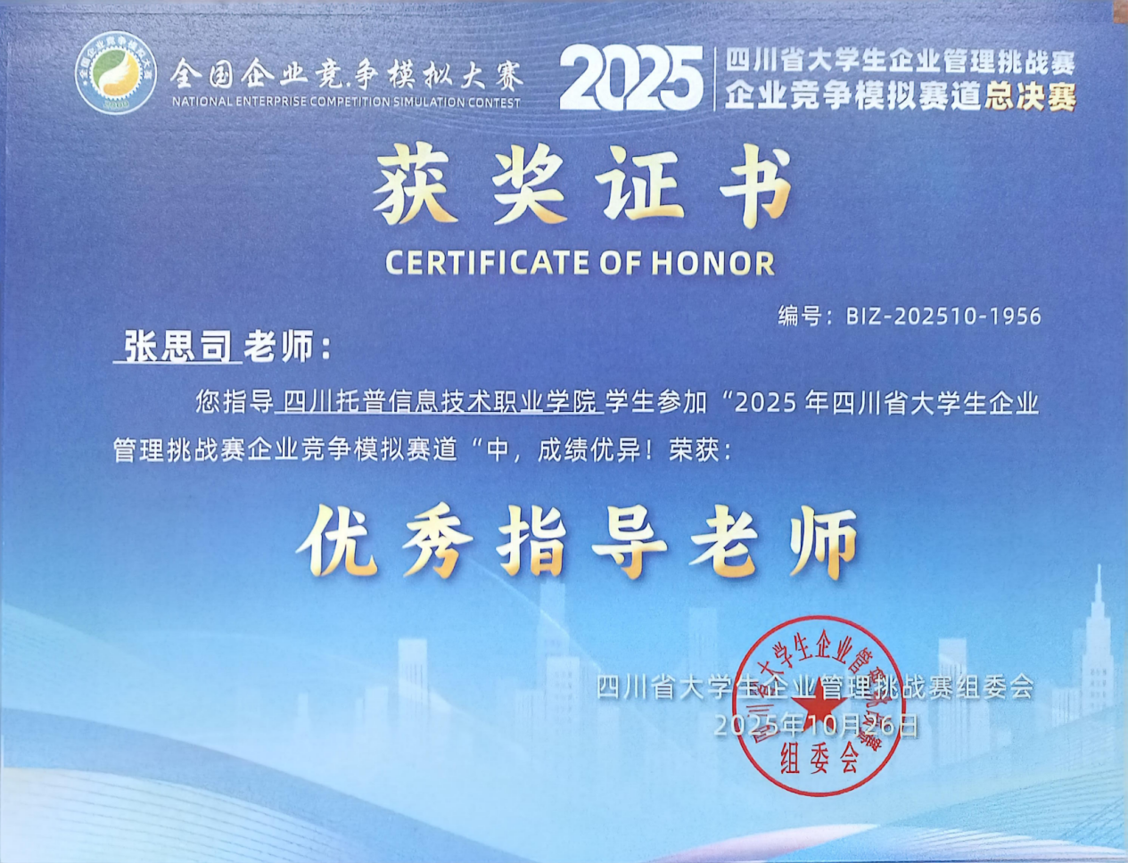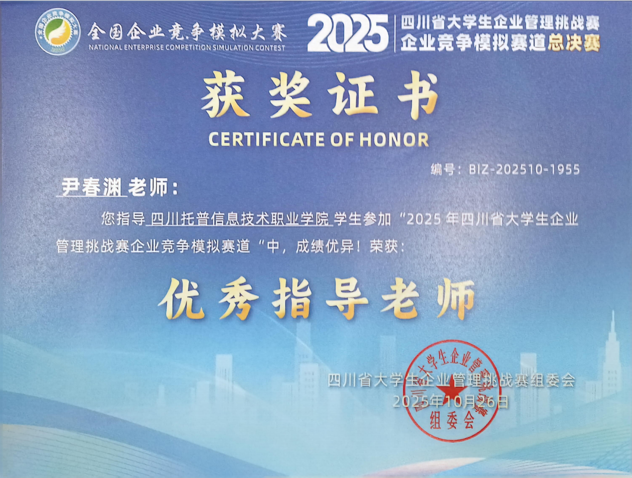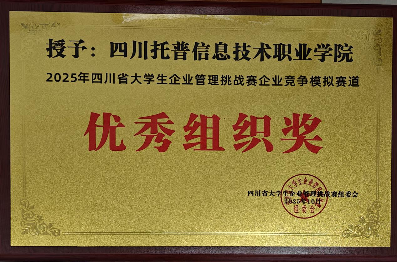 近日,2025年四川省大学生企业管理挑战赛企业竞争模拟赛道总决赛圆满落幕。四川托普信息技术职业学院数字经济与管理学院选派的多支参赛队伍发挥出色,共荣获省级一等奖1项、二等奖2项。张思司、尹春渊两位教师获评“优秀指导教师”。学校荣获“优秀组织奖”。