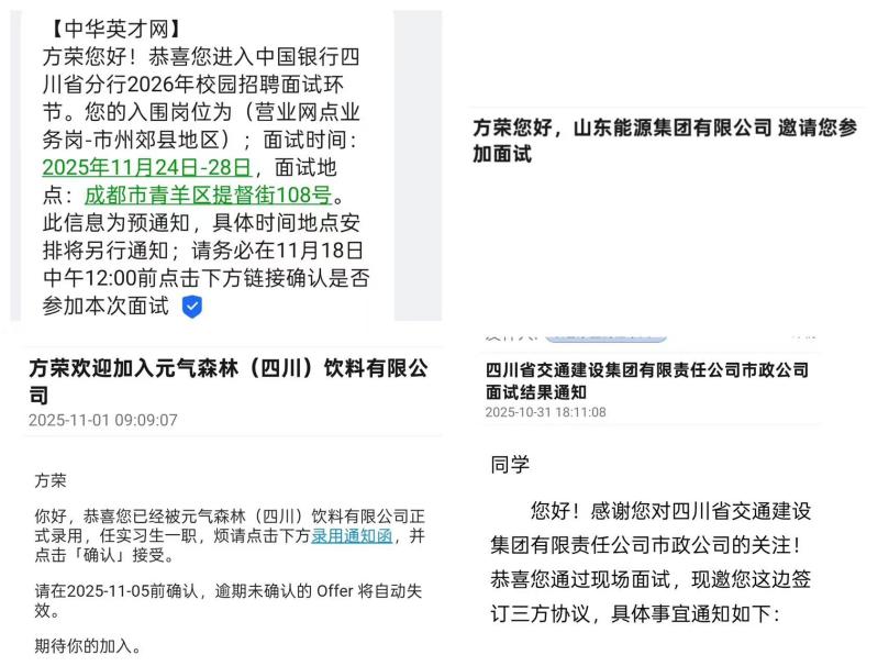 “最开始确实不想投简历,觉得没有适合的企业。”回想起几个月前的求职心态,土木工程学院铁道工程专业的方荣表示,那时的他不会想到,如今自己已手握四家企业的录用通知,还有三个面试机会正在推进,完成从被动等待到主动出击的完美蜕变。