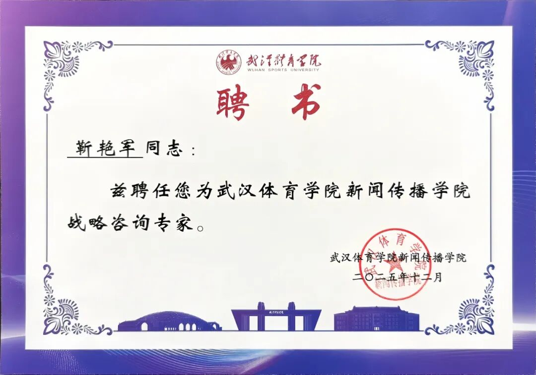靳艳军先生受聘为武汉体育学院产业教授、新闻传播学院战略咨询专家