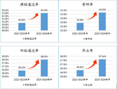 强化传帮带引领聚焦薪火相传,增强红齿轮传动力。学院积极探索全新育人路径,大力推动教授进学生社区,依托“青春领航”辅导员工作室,促进老师与学生展开面对面、心贴心的交流互动,激发学长以亲身经历为学弟学妹们答疑解惑、指引方向,为学风提升注入强劲动力,提升学生学习兴趣,促使课程通过率、四级通过率、学生毕业率以及考研录取率等数据较前三年均值显著提升,并获“2023-2024学风建设先进学院”。