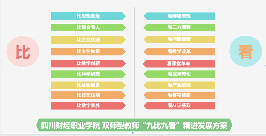 创新实施“九比九看”精进计划,围绕企业实践、社会服务、教学创新、技术攻关等维度,设置具体可比的标杆,引导教师对标找差、持续精进。配套“档案袋”记录成长、“首席导师”引领发展、“AI认证”适应未来、“名师工作室”树立标杆等“三制一室”举措,形成了一套可操作、可评价、可持续的“金师”品牌培育与激励机制,显著提升了“双师型”教师队伍建设的品牌辨识度与影响力。(四川财经职业学院)