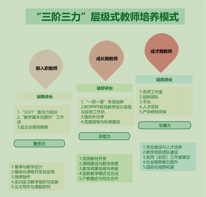 遵循教师生涯发展规律,构建新进教师、骨干教师、高层次人才“三阶”教师梯队,分别围绕胜任力、示范力、引领力,按照“分级负责、分类培训、分层培养”原则,分类分层制定教师培养计划及内容,实施“铸魂、赋能、提质”三大培养行动。采用“学校引导与学院落实、集中培训与个案指导、理论学习与实操训练“三结合”的方式,构建“三阶三力”双师型教师培养模式。