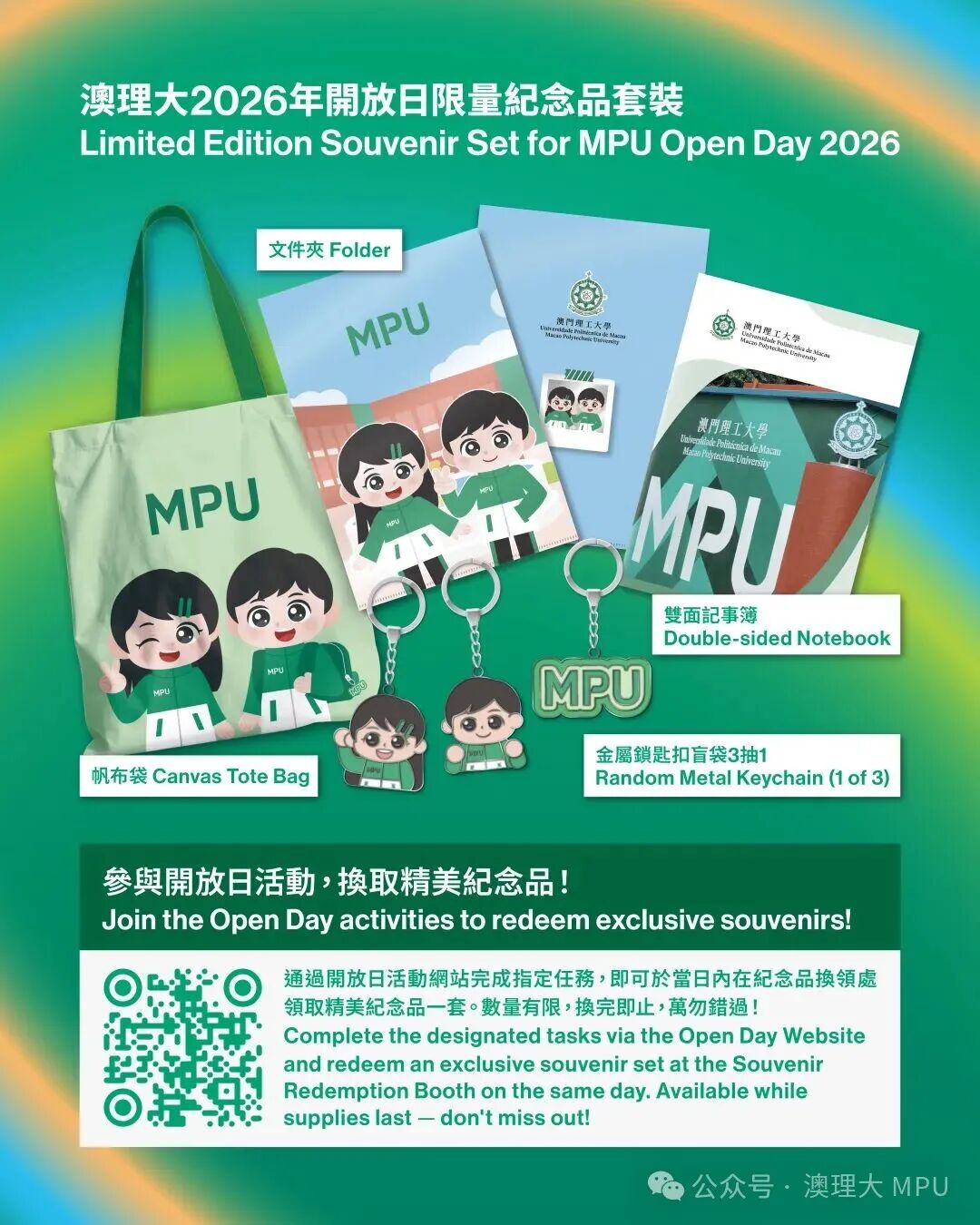 透过澳理大开放日活动网站完成指定任务获取积分,累积满6分即可于活动当日到澳理大正门纪念品换领处换领精美纪念品一套🎁。数量有限,换完即止,万勿错过!
