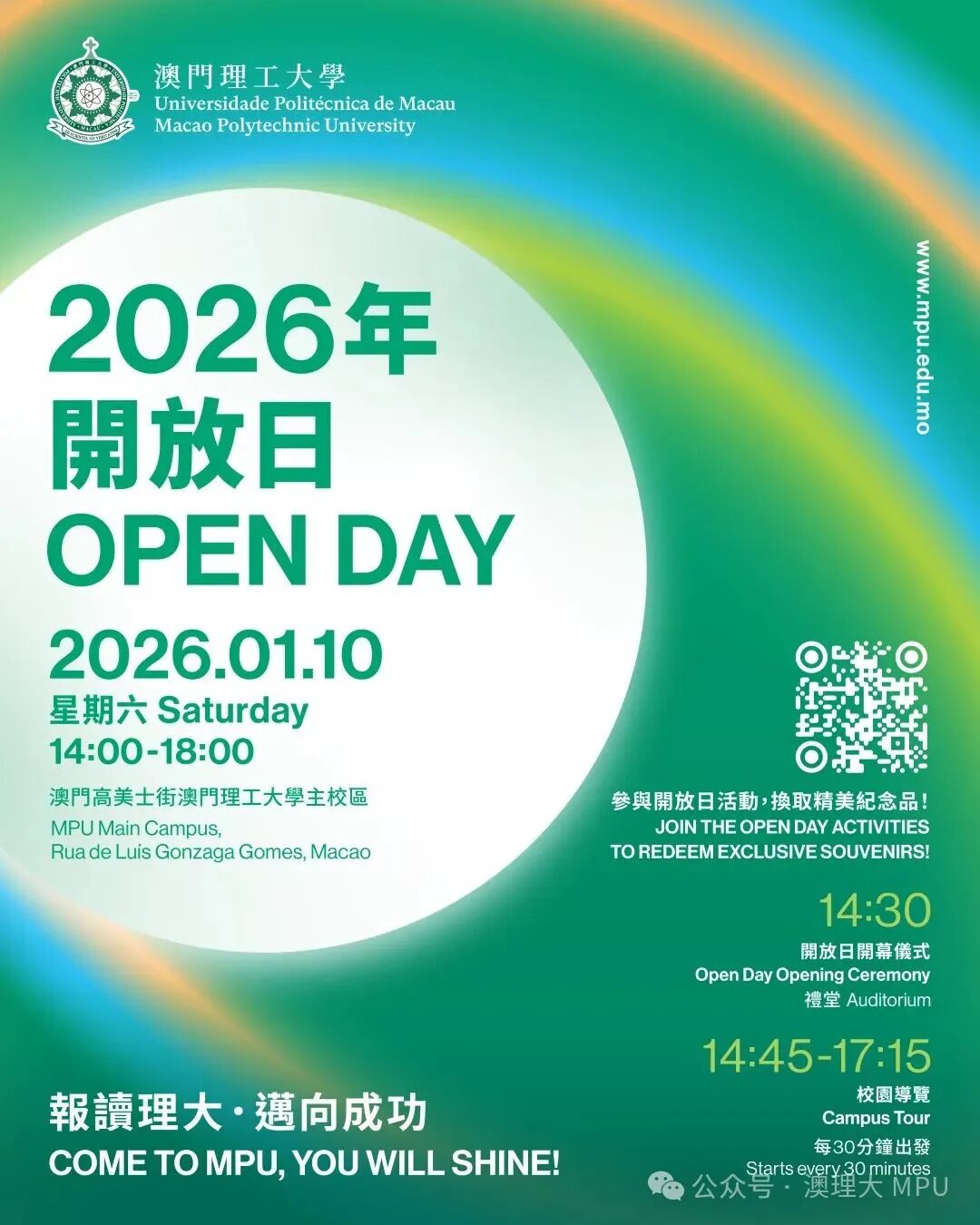 适逢澳门理工大学喜迎45周年之际,2026年开放日将于1月10日(星期六)举行!欢迎各位中学生、家长,以及市民大众亲临澳理大,体验校园环境、感受大学生活、探索心水学科、咨询未来发展、认识理大人、加入澳理大、参加体验活动获取精美的限量版纪念品套装。